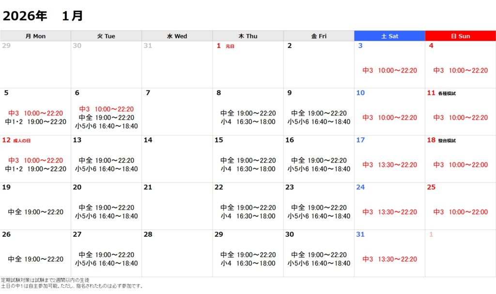 費用:冬期講習費および下記※の入試直前講習費込みで1月の指導料が計92,400円(税込)